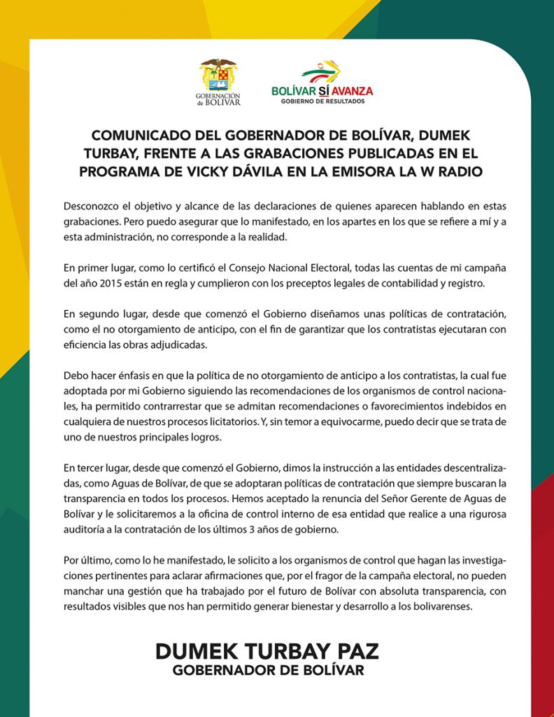 El Gobernador de Bolívar, Dumek Turbay, emitió un comunicado donde se refiere a las grabaciones divulgadas este lunes 23 de septiembre en el programa de la periodista Vicky Dávila en WRadio, y señala que «en los apartes en los que se refiere a mí y a esta administración, no corresponde a la realidad».