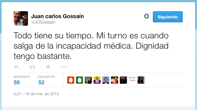 En su cuenta de Twitter escribió: “Todo tiene su tiempo. Mi turno es cuando salga de la incapacidad médica. Dignidad tengo bastante”.