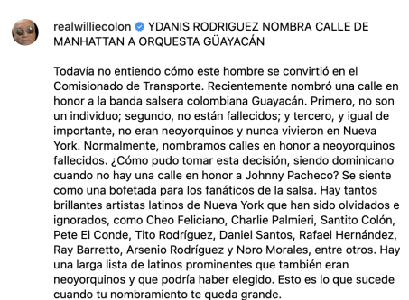 «Todavía no entiendo cómo este hombre [Ydanis Rodríguez] se convirtió en el Comisionado de Transporte. Recientemente nombró una calle en honor a la banda salsera colombiana Guayacán. Primero, no son un individuo; segundo, no están fallecidos; y tercero, y, igual de importante, no eran neoyorquinos y nunca vivieron en Nueva York. Normalmente, nombramos calles en honor a neoyorquinos fallecidos. ¿Cómo pudo tomar esta decisión, siendo dominicano, cuando no hay una calle en honor a Johnny Pacheco?»