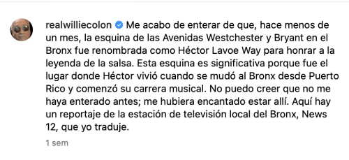 Tras la polémica, varias cuentas le hicieron saber a Colón que en Nueva York ya existe una calle en honor a Héctor LaVoe, tras los cual expresó: