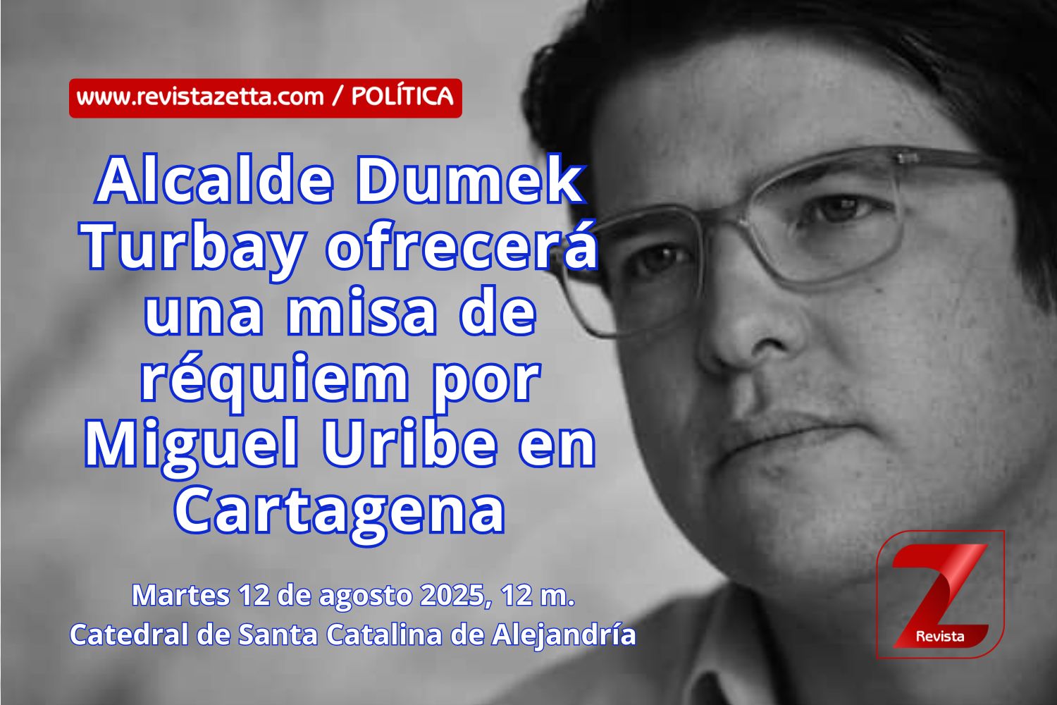 Cartagena de Indias, 11 de agosto de 2025.- A las 12 del mediodía de mañana martes 12 de agosto, en la Catedral de Santa Catalina de Alejandría, la Alcaldía de Cartagena ofrecerá una Misa de Réquiem por el descanso eterno de Miguel Uribe Turbay, luego de su fallecimiento en horas de la madrugada en la Fundación Santa Fe de Bogotá.