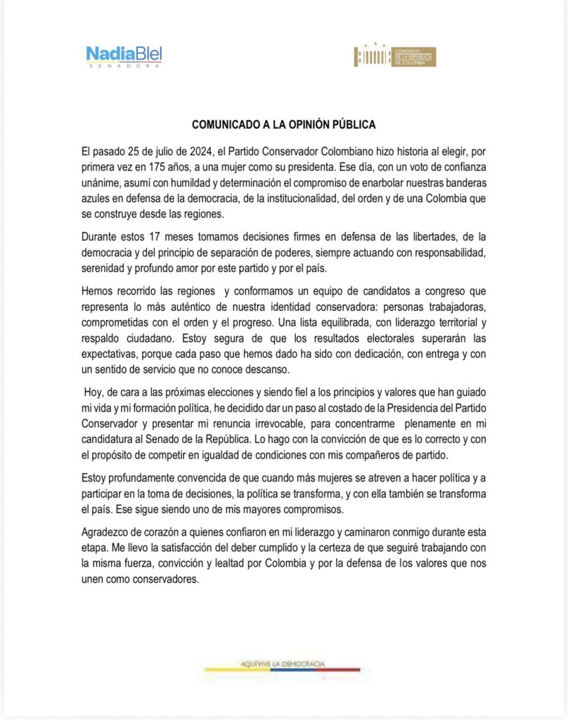 En una carta abierta, la senadora expresó que «de cara a las próximas elecciones y siendo fiel a mis principios y valores que han guiado mi vida y mi formación política, he decidido dar un paso al costado de la Presidencia del Partido Conservador y presentar mi renuncia irrevocable, para concentrarme plenamente en mi candidatura al Senado de la República. Lo hago con la convicción de que es lo correcto y con el propósito de competir en igualdad de condiciones con mis compañeros de partido».