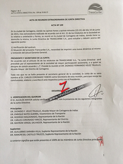 En la sesión extraordinaria de la Junta de Transcaribe estuvieron Dionisio Vélez, alcalde; Enrique Nates Guerra, viceministro de Transporte; Rodrigo Maldonado, representante de la Nación; Carlos Coronado, representante del Distrito; Mayro Vergel Salvador, representante de la Nación, y los suplentes Guillermo Saravia Villa Ramón del Castillo Trucco.