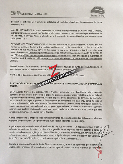 Según el acta de esa reunión, “el Sr. Alcalde Mayor, Dr. Dionisio Vélez Trujillo, actuando como presidente de la reunión, comenta que si bien es cierto que el proyecto presenta unos avances notables, esto se debe al impulso que se le ha dado desde la Alcaldía”.